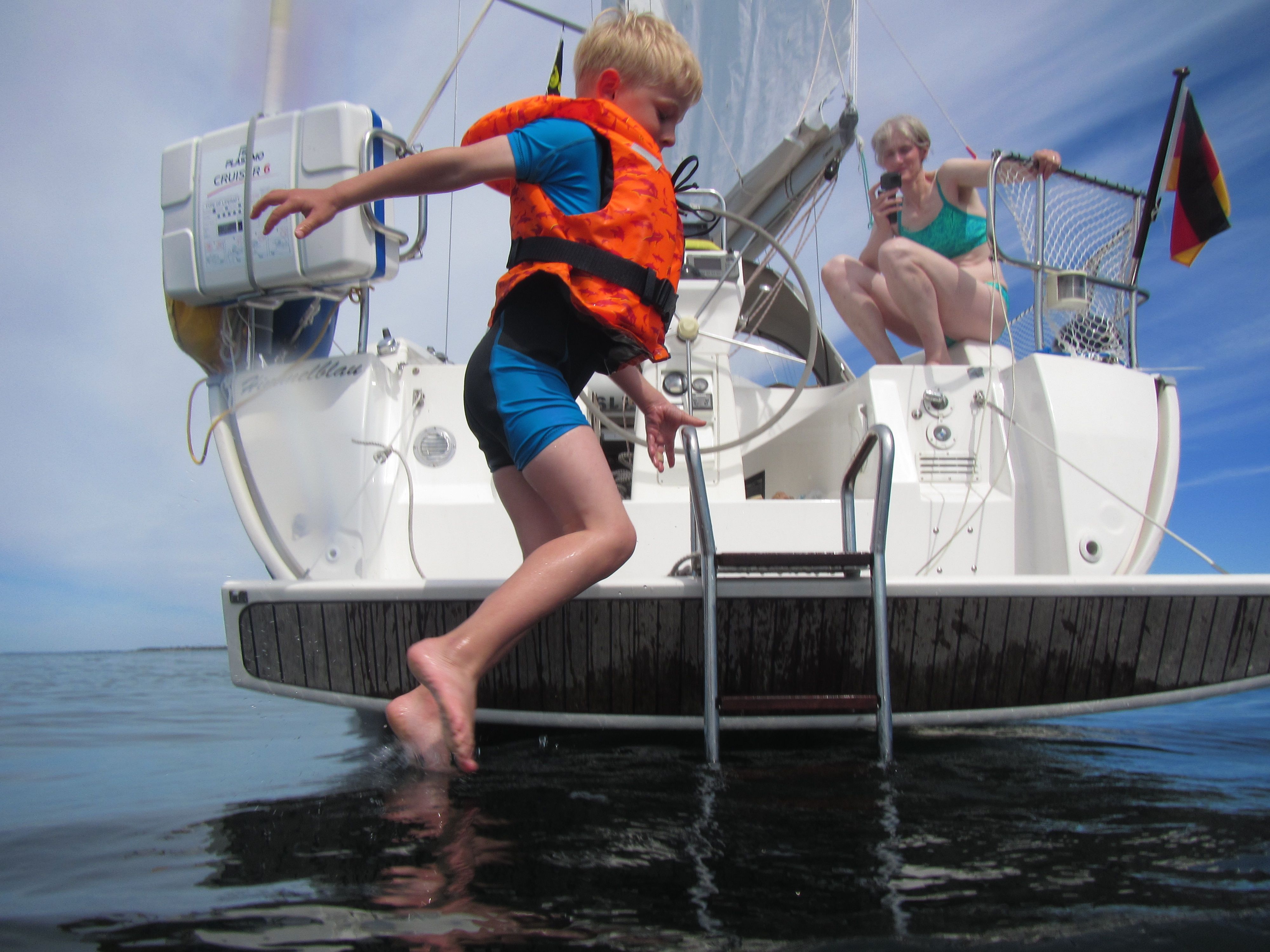 Auf dem Weg nach Sandvik auf Öland am Mittwoch war das Wetter so gut und der Wind so schwach, dass wir zwischendurch mal wieder eine Badepause eingelegt haben. Selbst Benedikt ist vom Boot ins Wasser gesprungen – fand es dann doch aber für ihn zu kühl, um länger im Wasser zu bleiben. Die Sommerresidenz der schwedischen königlichen Familie Schloss Solliden bei Borgholm konnten wir leider nur aus der Entfernung wahrnehmen, da die Wasserflächen vor dem Schlosspark gesperrt sind.