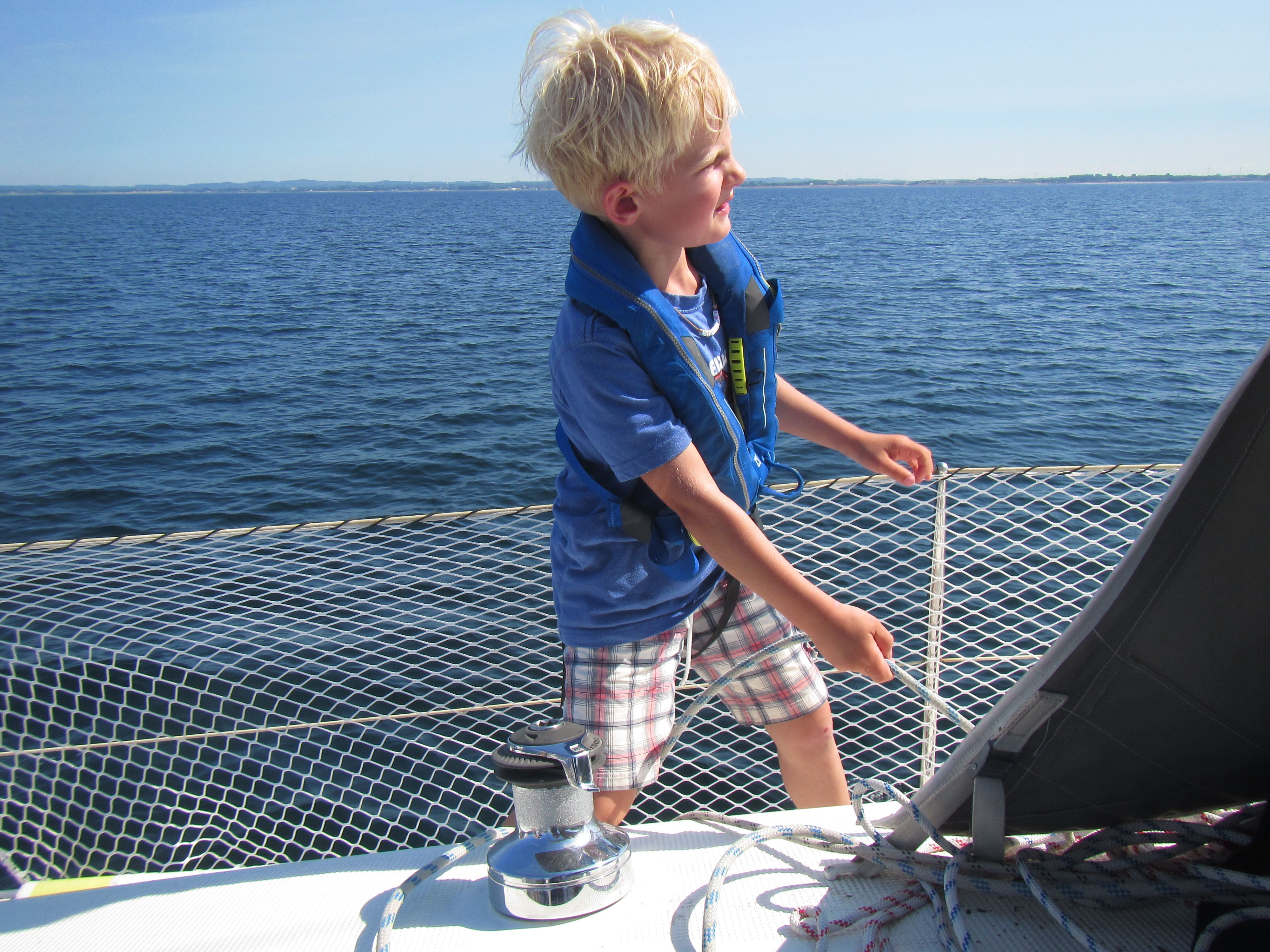 Morgens um 8 Uhr laufen in Träslövsläge sieben Fischkutter in Folge ein. Es gibt ganz viel Kaisergranat (kleine Hummer) – auch prima, wir kaufen 2 kg ein. Es hat um 9:00 Uhr, als wir ablegen, schon 24 °C und keinen Wind. Das Wasser ist so ruhig, dass selbst die Möwen auf der offenen Wasserfläche des Kattegat nur so vor sich hindümpeln. Im Laufe des Tages kommt dann doch ein schöner Segelwind auf, zunächst aber noch so leicht, dass Benedikt die Schoten aus der Hand fahren kann. Später können wir bei achterlichen Winden Schmetterling fahren (mangels Spinnaker). Am frühen Nachmittag können wir dann sogar unter Segeln in den Hafen von Falkenberg einlaufen.
