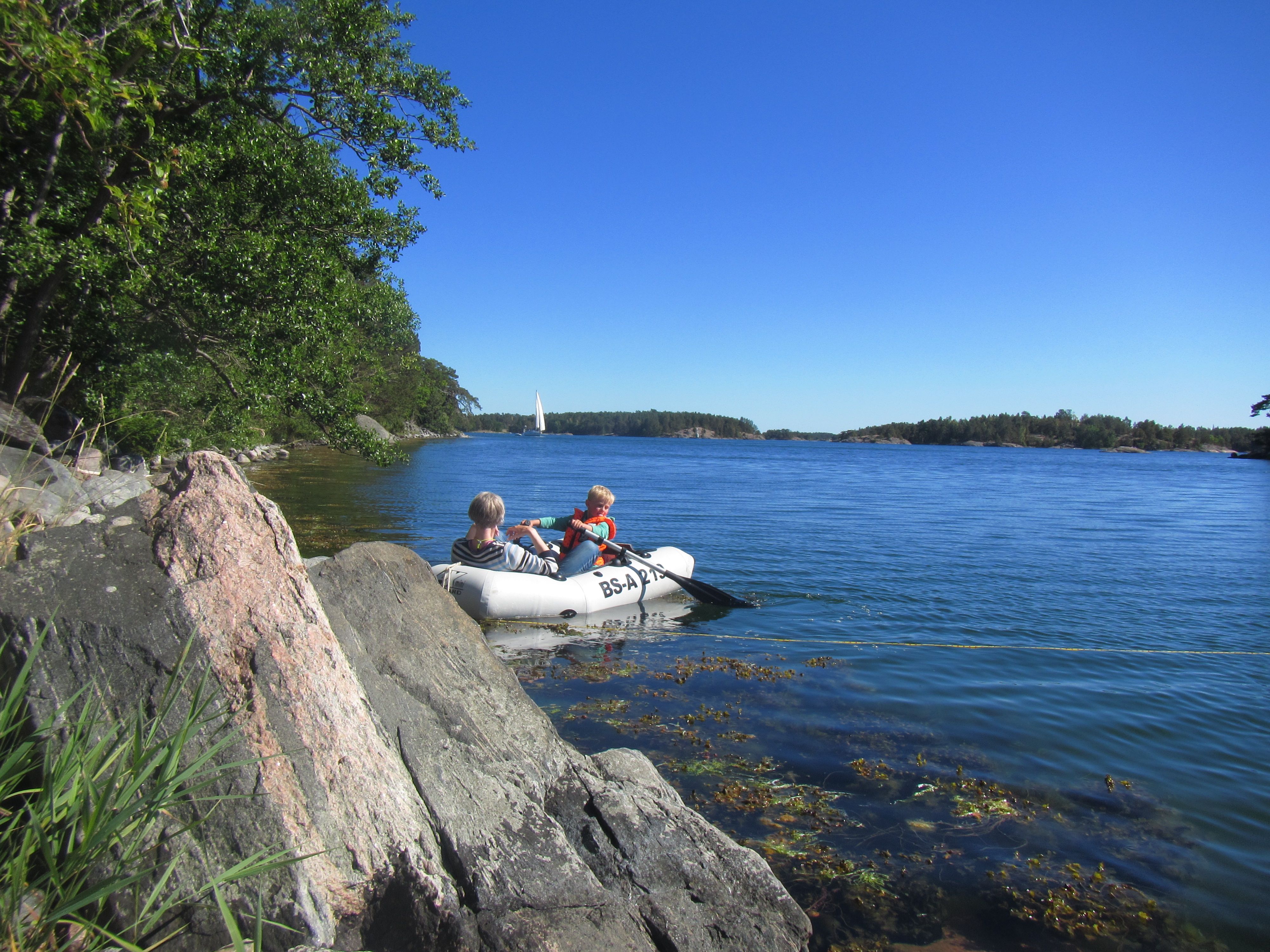 Benedikt versteht sich mit dem Rudern mittlerweile ganz gut, so dass er uns einzeln zum Land und zurück rudert. Wir erklimmen wieder die Felsen, die an dieser Stelle ganz schön steil sind. Mit dem Schlauchboot drehen wir unter Ruder und mit Motor ein paar Runden in der näheren Umgebung. Wir landen auf der wahrscheinlich kleinsten Insel unserer Reise an: das kleine Inselchen im Fahrwasser vor unserer Ankerbucht misst ca. 12 m im Durchmesser und ist von der letzten Eiszeit noch schön rund geschliffen. Und ausnahmsweise sind wir schon um 19 Uhr mit dem Abendessen fertig und genießen einen ruhigen, windstillen Abend, während Benedikt in der Kajüte spielt.