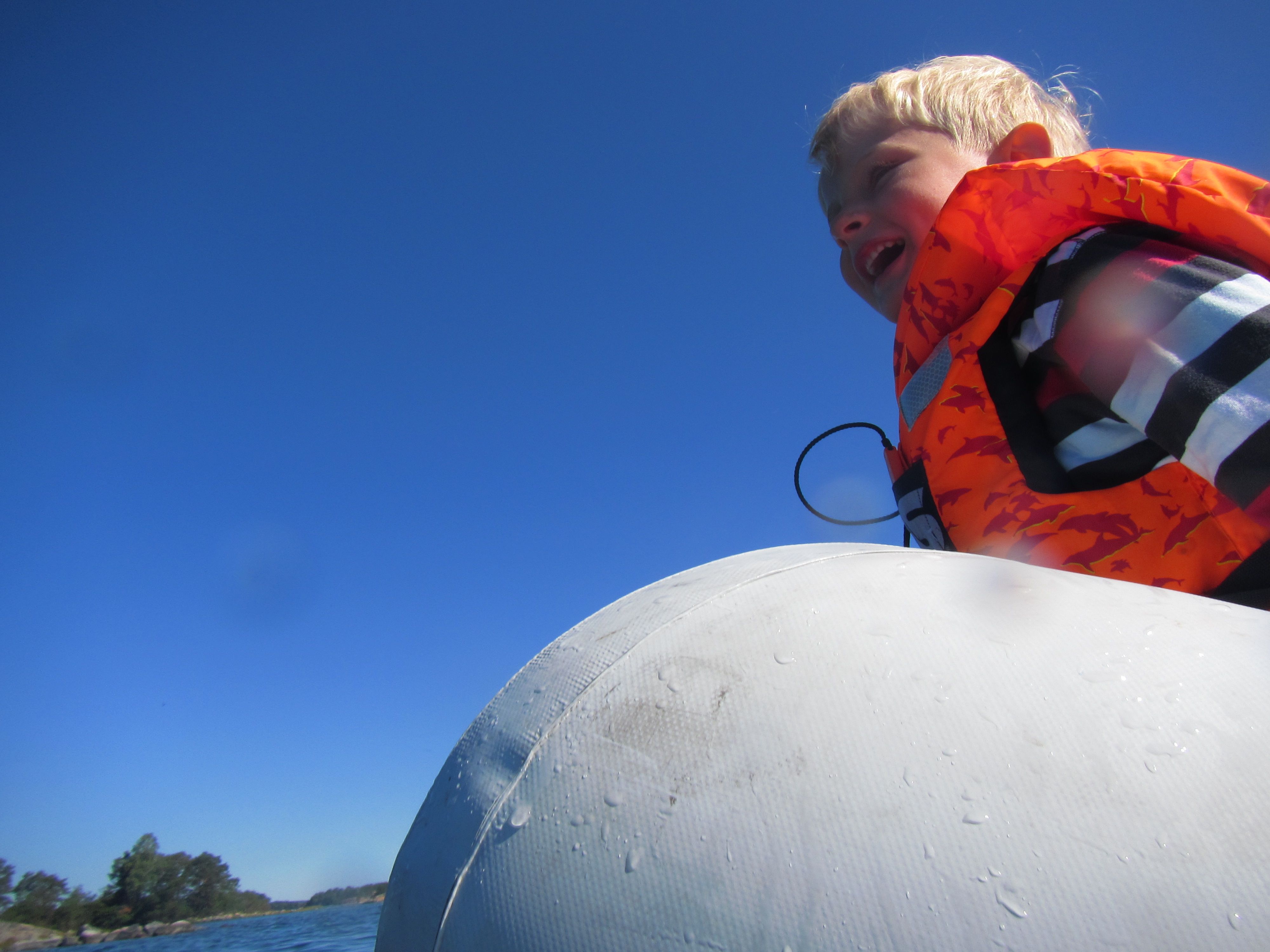 Unter Segeln geht es in die miteinander verbundenen Buchten im Osten von Risö. Die Bucht bietet schöne Anlegeplätze an niedrigen, großen, abgerundeten Felsen – an Verholmskären machen wir fest. Wir gehen aber dennoch mit dem Schlauchboot an Land, da unser steiler, hoher Bugsteven uns bei den niedrigen Felsen einen ganz schönen Satz abverlangt. Benedikt sorgt aber mitunter für einen turboschnellen Transfer mit dem Ruderboot in der Bucht.