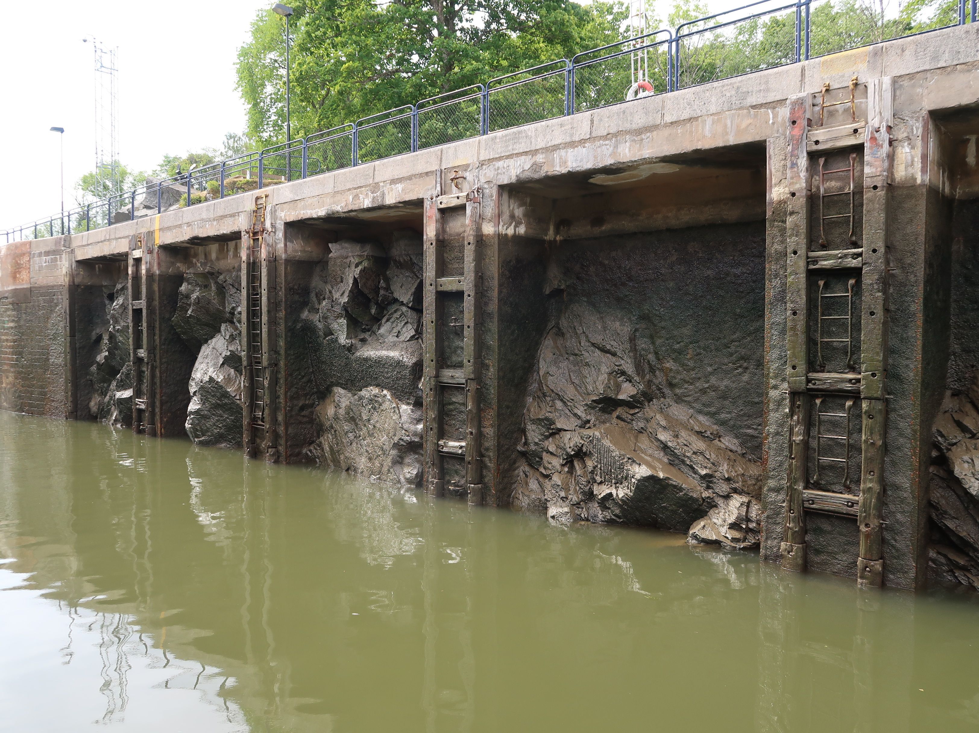 Wir legen am Dienstag, 17. Juli 2018, früh ab und frühstücken auf See, da wir bis nach Trollhättan wollen. Es geht durch eine Schleuse und zahlreiche Brücken, die schon fast einen kleinen Überblick über die Technikgeschichte geben. Die Schleuse ist auf einer Seite naturbelassen, so dass wir schauen, wir am besten das Boot festmachen.