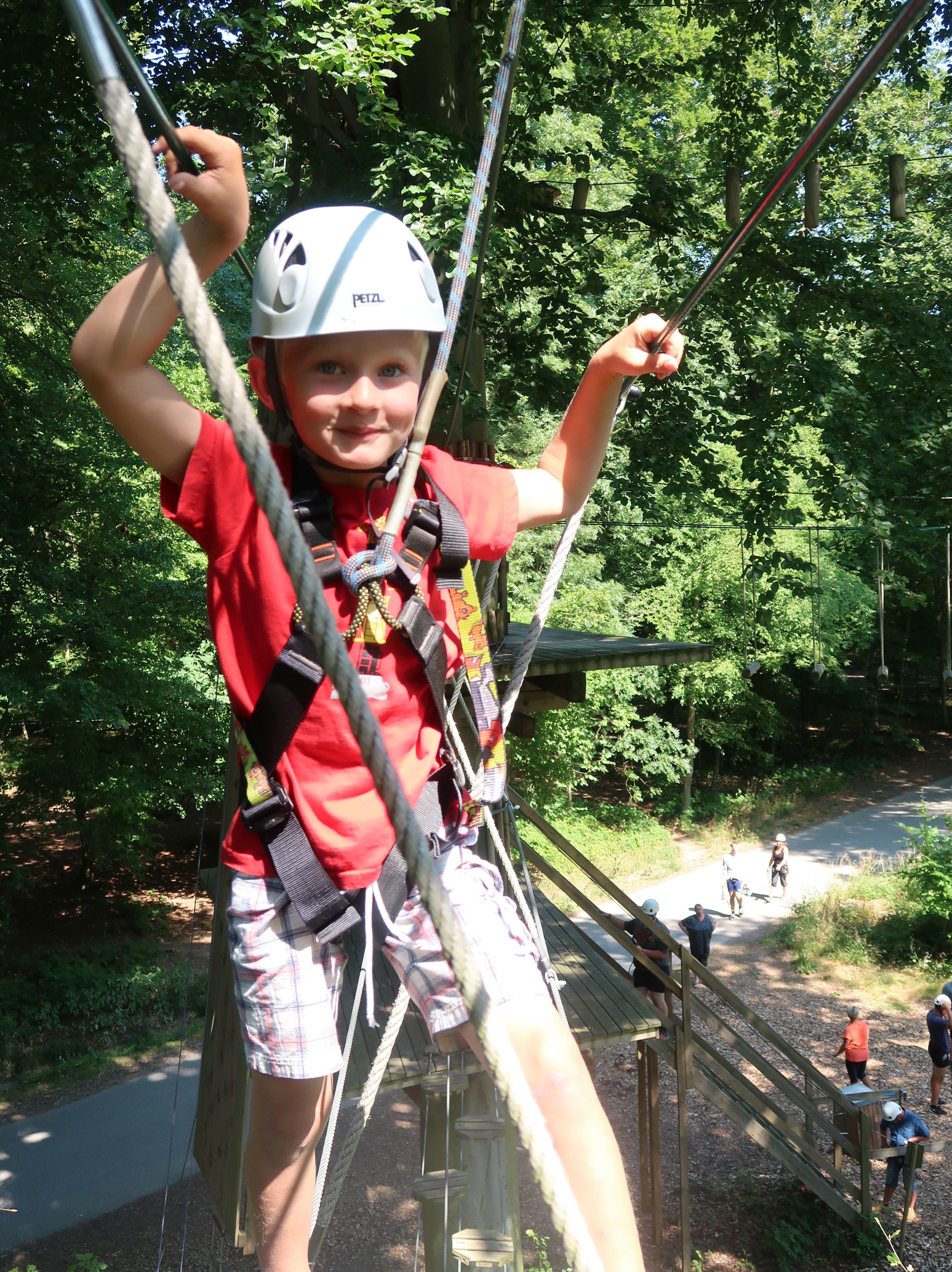 Der Hochseilgarten sieht auf den ersten Blick nicht so groß aus, hat aber sechs schöne Parcoure, die für uns voll ausreichen – wir klettern alle. Er ist schön gelegen in einem Wäldchen mit großen Buchen (also vor allem schön schattig und kühl bei dem warmen Wetter) und teilweise netten Ausblicken auf den Ostseeausläufer vor Gavnø. Insteressant sind die „Fischerreusen“, durch die es hoch und runter zu klettern geht.